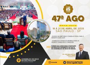 A Convenção Geral das Assembleias de Deus no Brasil vai realizar a 47ª Assembleia Geral Ordinária entre 18 e 21 de abril de 2025, na cidade de São Paulo (SP). O evento promoverá reuniões para toda família, como os ministros, esposas e filhos. O tema do evento este ano é “Cheios do Espírito Santo, para anunciar com ousadia a palavra de Deus” (Atos 4.31). As inscrições estão abertas e podem ser realizadas no site www.cgabd.org.br.