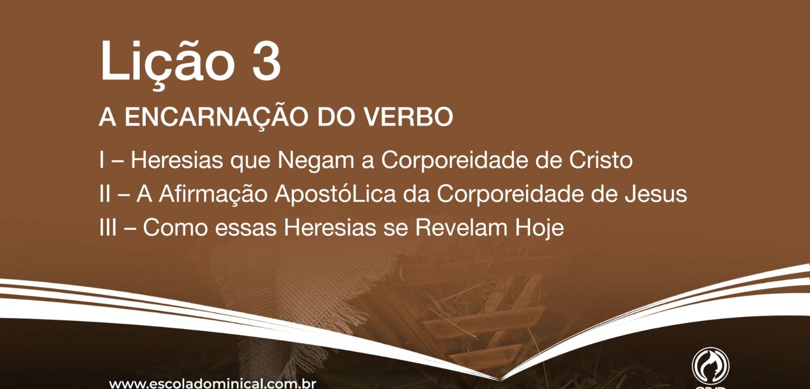 A aula deste domingo, dia 19, na sala de adultos da Escola Bíblica Dominical (EBD) tem como tema “A encarnação do verbo”. Serão aplicados três tópicos da lição: 1. Heresias que negam a corporeidade de Cristo, 2. Afirmação apostólica da corporeidade de Jesus e 3. Como essas heresias se revelam hoje. A EBD começa às 9h.