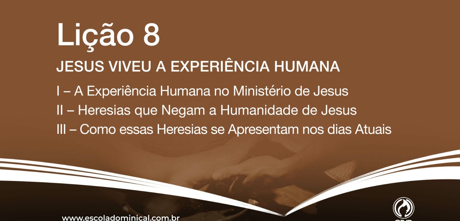 O tema da lição deste domingo, dia 23, na sala de adultos da Escola Bíblica Dominical (EBD) será “Jesus viveu a experiência humana”, cuja verdade prática diz que o senhor Jesus Cristo teve vida social, amigos, parentes, interagia com as pessoas, e era conhecido dos vizinhos e moradores de Nazaré, onde fora criado. O estudo abordará três importantes tópicos: 1) A experiência humana no ministério de Jesus; 2) A vida social e religiosa de Jesus; 3) Características próprias do ser humano. A aula na Sede e demais congregações começa às 9 horas.