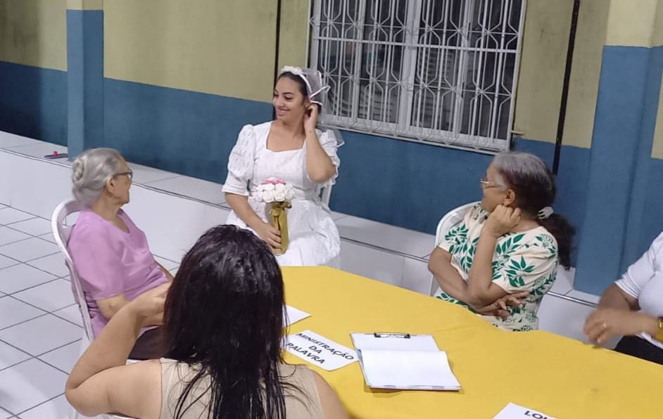 CHÁ DE LINGERIE – Durante a reunião de uma equipe de Senhoras realizada na noite de segunda-feira, dia 21, a noiva participou de uma brincadeira onde ganhou lingeries e edredom para usar na lua de mel. As irmãs se alegraram e em seguida se confraternizaram com bolos, salgados, sucos e refrigerantes.