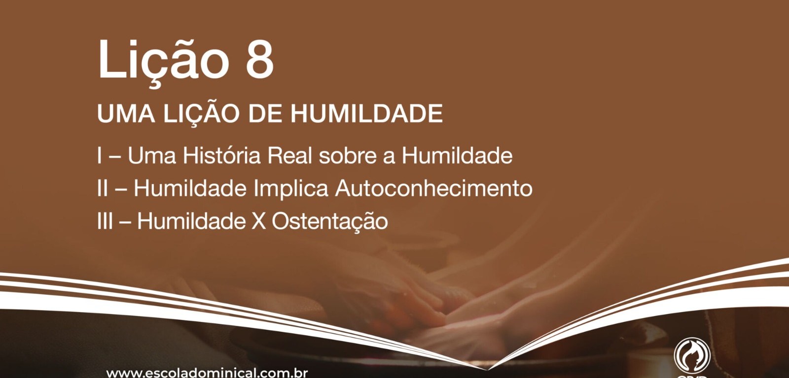 A lição 8 de amanhã, dia 25, terá como tema “Uma lição de humildade” na sala de adultos da Escola Bíblica Dominical (EBD). O estudo vai apresentar os seguintes tópicos: 1) Uma história real sobre a humildade; 2) Humildade implica autoconhecimento; 3) Humildade x Ostentação. A EBD começa às 9 horas.