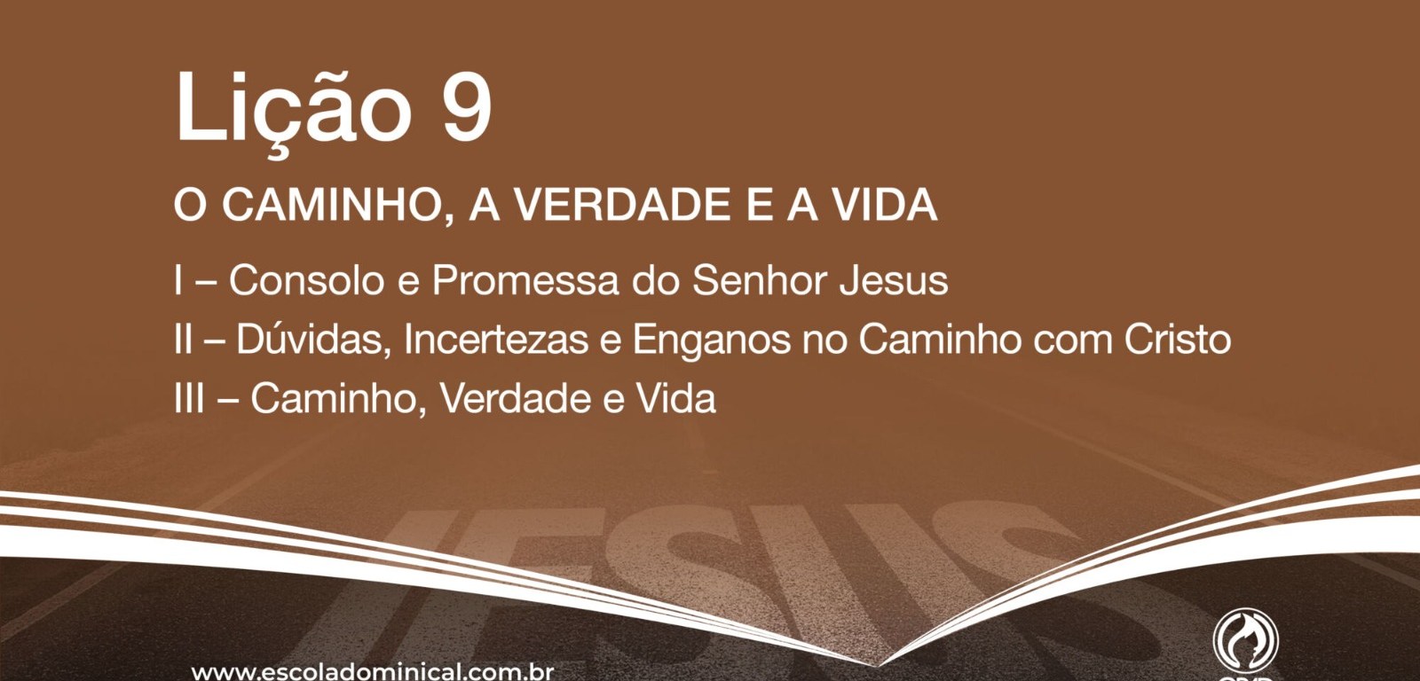 A Escola Bíblica Dominical (EBD) vai trazer neste domingo, dia 1º, o estudo sobre “O caminho, a verdade e a vida” na sala de adultos. Baseado no texto de João 14.6, aula vai abordar os seguintes tópicos: I) Consolo e promessa do Senhor Jesus; II) Dúvidas, incertezas e enganos no caminho com Cristo; III) Caminho, verdade e vida. A EBD acontece todo domingo, das 9h às 11h, e dispõe de sala de aula para todas as idades.