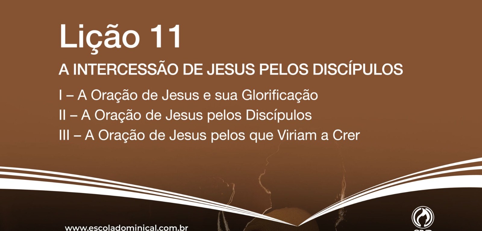 A intercessão de Jesus pelos discípulos. Este é o tema da lição de hoje, dia 15, na sala de adultos da Escola Bíblica Dominical (EBD). O tema vai abordar sobre: I) A oração de Jesus e sua glorificação; II) A oração de Jesus pelos discípulos; III) A oração de Jesus pelos que viriam a crer. A EBD e realizada todo domingo, com salas para todas as idades, sempre das 9h às 11h.